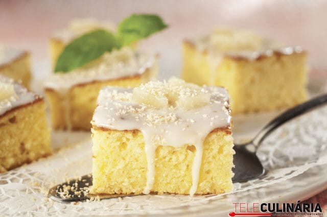 Instruções: 1. Ligue o forno a 180°C, unte um tabuleiro rectangular com margarina e polvilhe-o com farinha. Numa tigela, bata a manteiga com o açúcar e as gemas até obter uma mistura cremosa. 2. Triture as rodelas de ananás numa picadora ou liquidificador, deite numa tigela, junte 1 dl da própria calda e o licor de coco, misture bem, adicione à tigela com o preparado da manteiga e bata mais um pouco. Junte então a farinha, o fermento e o coco ralado e bata novamente. 3. À parte, bata as claras em castelo e envolva-as no preparado anterior. Verta para o tabuleiro e leve ao forno durante cerca de 30 minutos. Verifique a cozedura com um palito, retire e deixe arrefecer. 4. Misture o leite com o açúcar em pó e umas gotas de sumo de limão, verta sobre o bolo, deixe secar, corte em cubos e sirva decorados a gosto ou como vê na foto.
