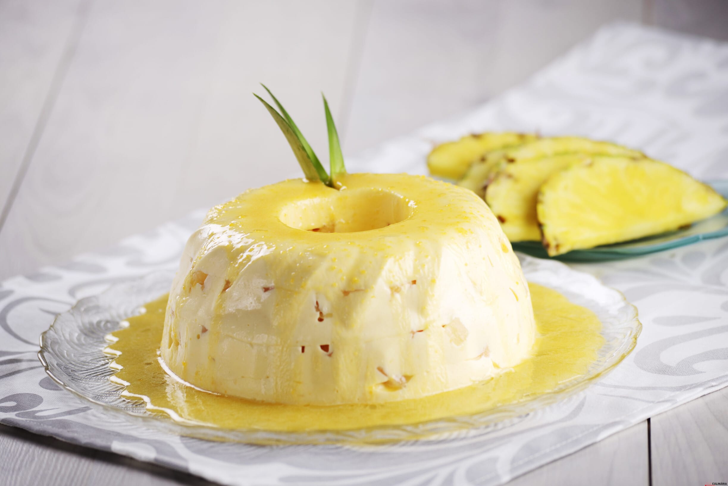 Instruções: 1. Demolhe as folhas de gelatina em água fria. Deite a calda do ananás num tacho, junte o açúcar e as gemas e leve ao lume, mexendo sempre até engrossar. 2. Retire do lume, adicione as folhas de gelatina escorridas, mexa bem e deixe arrefecer. À parte, bata as claras em castelo e envolva-as no preparado. Verte numa forma de abrir untada com óleo, alise e leve ao frio até solidificar. 3. Prepare a gelatina conforme as instruções da embalagem, utilizando apenas 4 dl de água quente, mexa e adicione mais 4 dl de água fria. Deixe arrefecer. Disponha as rodelas de ananás sobre o doce na forma, regue com um pouco de gelatina e leve ao frio até prender o ananás. 4. Regue depois com a restante gelatina e leve mais uma vez ao frio até solidificar completamente. Na hora de servir, desenforme e decore a gosto.
