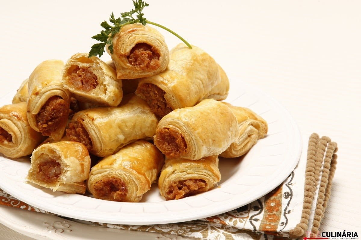 Instruções: 1. Pique as farinheiras com um palito e leve-as a cozer em água durante 10 minutos. Depois escorra-as e deixe-as arrefecer um pouco. 2. Ligue o forno a 200 graus. Retire a pele às farinheiras e esmague bem o recheio. Estenda a massa folhada com o rolo em cima da mesa polvilhada de farinha deixando-a em forma de rectângulo e com uma espessura fina. Espalhe em cima a farinheira e enrole até ficar um rolo fino e bem fechado. 3. Corte o rolo em pedaços e disponha-os no tabuleiro do forno previamente passado por água fria. Pincele-os com ovo batido e leve ao forno durante 20 minutos ou até ficarem douradinhos. Retire e sirva mornos e decorados a gosto.
