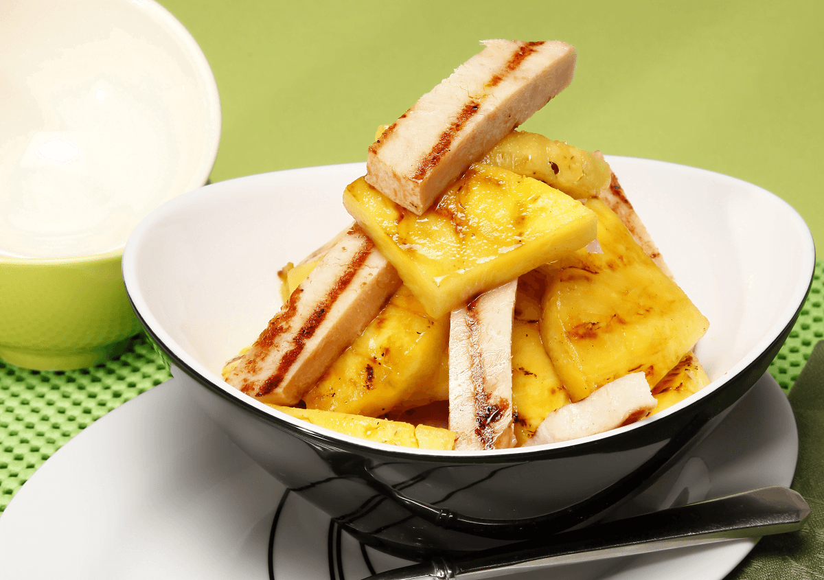 Instruções: 1. Descasque e lave o ananás, corte-o em quartos e depois em fatias. 2. Aqueça uma grelha e grelhe a fatia de fiambre e o ananás. Retire-os da grelha, tempere-os com um pouco de pimenta moída e regue-os com o azeite. 3. Corte o fiambre em tiras e junte-as com as fatias de ananás. Sirva de seguida.
