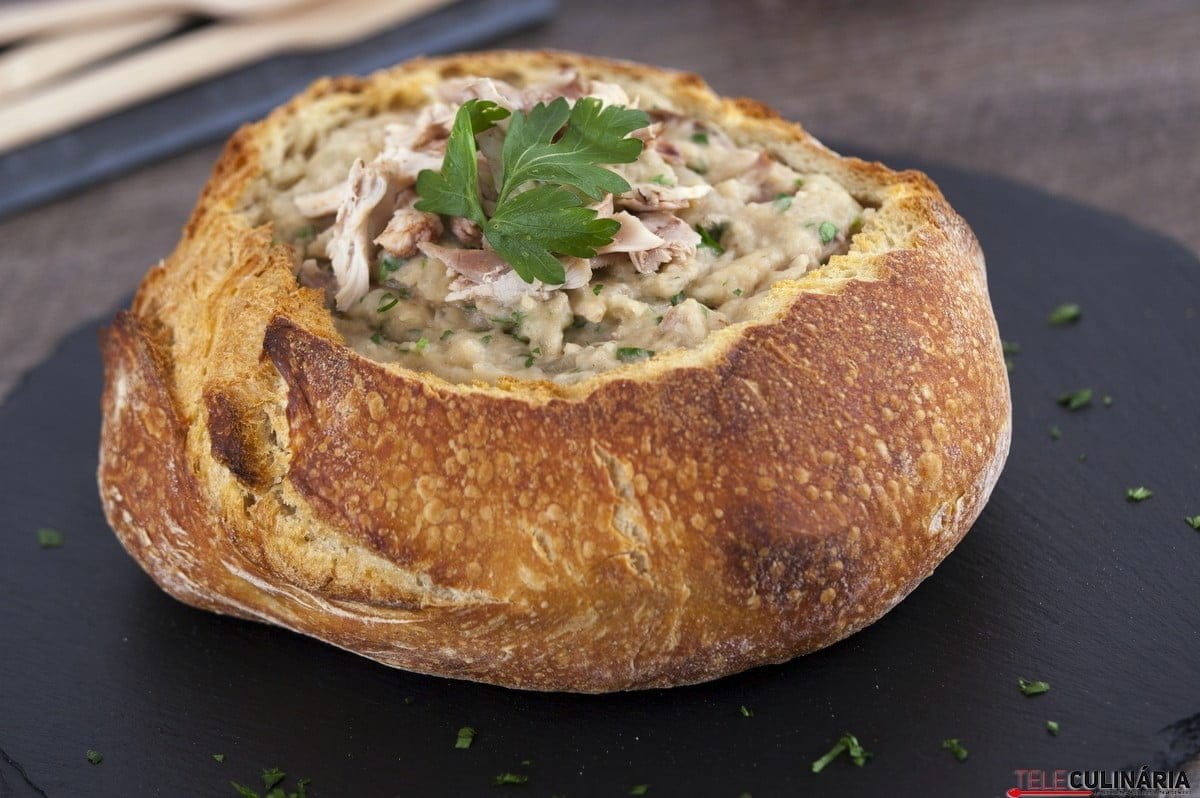 Instruções: 1. Arranje o peixe, leve-o a cozer em água, escorra-o, retire-lhe as peles e as espinhas e lasque-o finamente. Reserve o caldo. 2. Corte uma “tampa” ao pão, retire-lhe o miolo mantendo o exterior inteiro, corte-o em pedaços e deite-os numa tigela. Regue com um pouco do caldo de cozer o peixe de modo a ensopar muito bem. Arranje a couve retirando-lhe a parte mais dura, enrole as folhas, corte-a finamente como se fosse caldo verde, leve-a a cozer em água temperada de sal, depois escorra-a e reserve-a. 3. Descasque e lave os dentes de alho, deite-os numa picadora, junte um pouco de coentros e o azeite, ligue e deixe triturar muito bem. Escorra o feijão-frade, coloque-o num passador de rede, passe-o por água e deixe-o escorrer muito bem. 4. Leve um tacho ao lume com a mistura do azeite, deixe aquecer, adicione depois a couve, o feijão-frade, o pão previamente escorrido e o peixe e deixe cozinhar, mexendo de vez em quando, até ficar uma açorda macia. Rectifique os temperos, retire do lume, deite na côdea de pão e sirva decorado a gosto, como vê na foto.