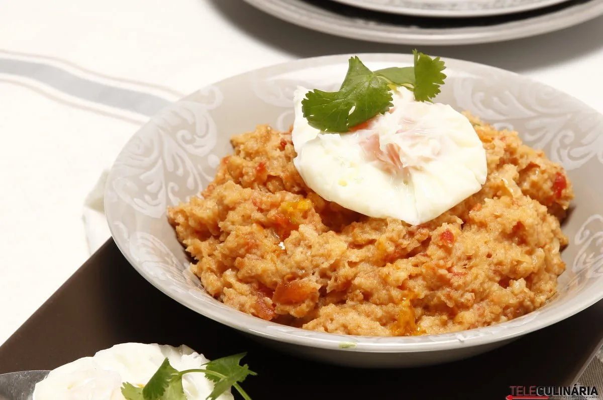 Instruções: 1. Deite a água numa tigela que possa ir ao microondas, junte o caldo de marisco e leve ao microondas a 900 watts durante 6 minutos ou até a água começar a ferver. Depois junte o bacalhau e ligue mais 5 minutos na mesma potência. Retire do microondas, reserve a água, deixe amornar o bacalhau, depois rejeite-lhe as peles e as espinhas e desfie-o. 2. Retire a côdea ao pão, corte o miolo em pedaços, deite-os na tigela com a água de cozer o bacalhau e deixe ensopar bem. Descasque e lave os dentes de alho, deite-os para um recipiente que possa ir ao microondas, adicione o azeite e ligue 3 minutos a 900 watts. 3. Retire, junte o pão, o bacalhau desfiado e um pouco de coentros picados, envolva e leve novamente ao microondas na mesma potência durante 1 minuto, mexendo de vez em quando. Retire, rectifique os temperos, adicione as gemas e mexa bem na hora de servir.