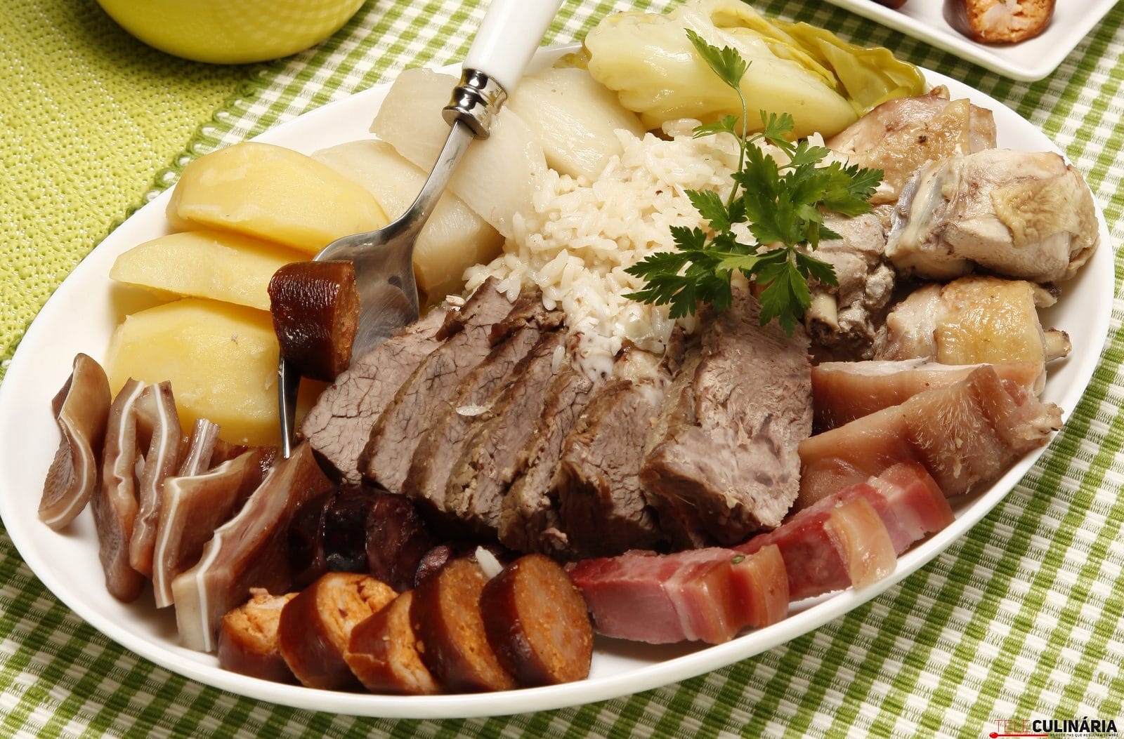 Instruções: 1. Arranje a orelha de porco, tempere todas as carnes com sal e deixe repousar no frio, de preferência durante 2 dias. 2. No dia, descasque nabos, as batatas e as batatas-doces, corte-os ao meio e coloque-os a demolhar em água fria. Deite a carne de vaca e o osso numa panela com um pouco de água, leve ao lume e deixe ferver, retirando a espuma que se forma à superfície. Junte mais água até cobrir, tempere com sal e pimenta e deixe cozer até a carne ficar macia. Retire e reserve a carne. Rejeite o osso de vaca, impurezas e gordura em excesso ao caldo na panela, adicione a galinha (ou frango), deixe cozer, retire e reserve. 3. Escalde a orelha em água quente, depois coza-a juntamente com os enchidos, o bacon e o presunto na mesma panela com o caldo, retirando conforme forem ficando cozidos. Adicione então os nabos e todas as couves arranjadas e deixe cozer, juntando as batatas e as batatas-doces a meio da cozedura. À parte, coza o arroz em cerca de 6 dl de água ou caldo de carne. No final, aqueça tudo num pouco do caldo da cozedura e sirva com as carnes e a galinha cortadas em pedaços e os enchidos em rodelas, como vê na foto.