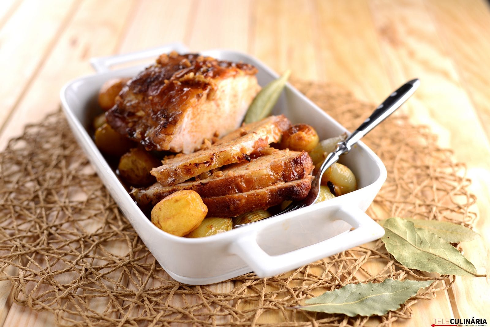 Lombo de porco no forno com cebolinhas novas e batatinhas