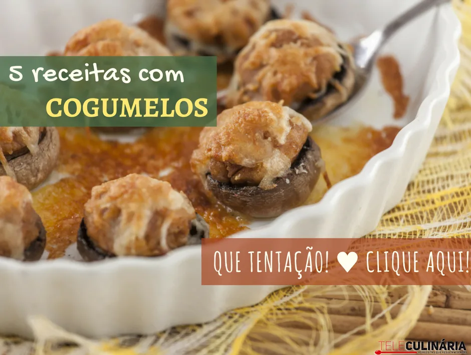 5 receitas com cogumelosCogumelos recheados com alheira Veja aqui a receita.Bifes de perú com cogumelos Veja aqui a receita.Hambúrgueres no forno com molho de cogumelosVeja aqui a receita.Fettuccine com frango e cogumelos Veja aqui a receita.Carne estufada com cogumelos Veja aqui a receita.