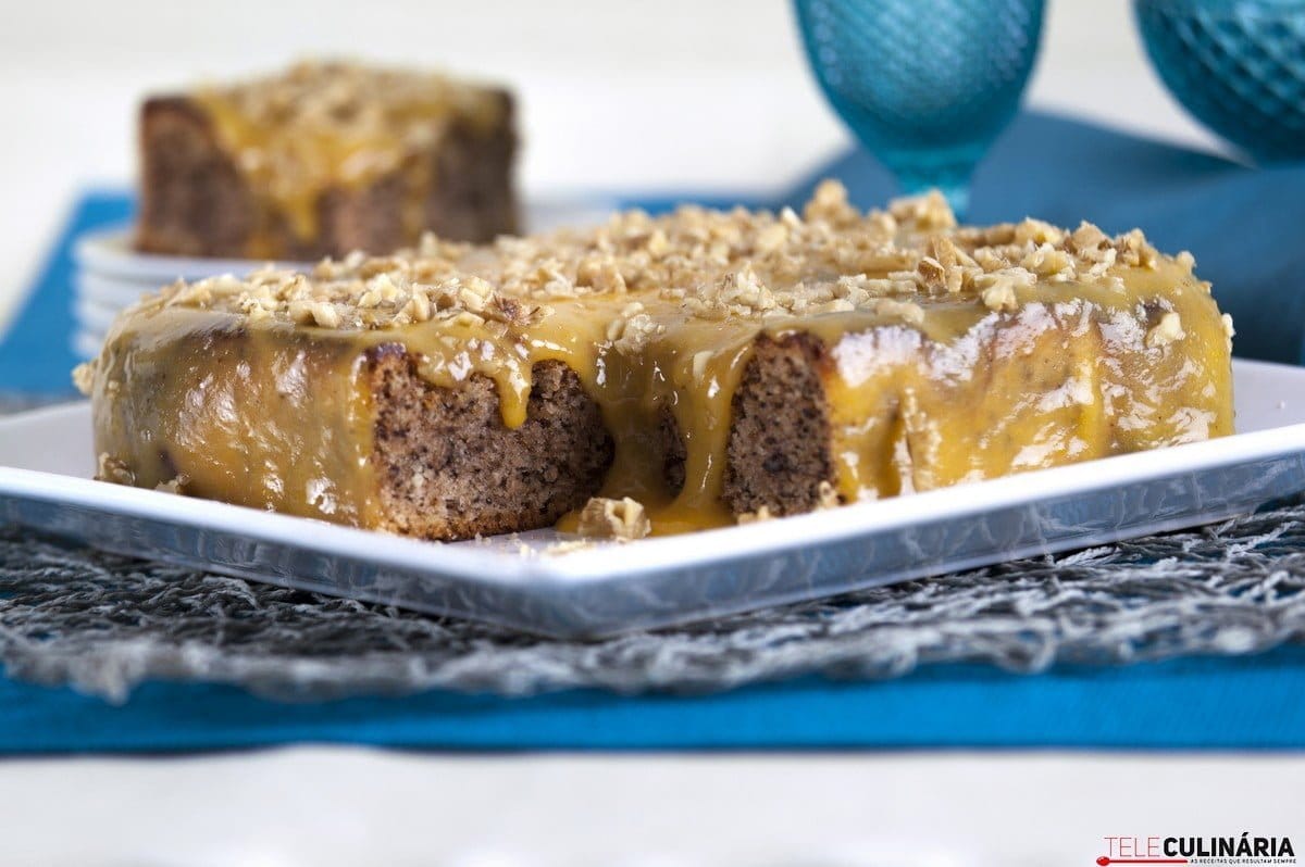 Instruções: 1. Num tacho, coloque as gemas batidas, junte a água e o açúcar e mexa bem. Leve ao lume, mexendo sempre até engrossar. Deite numa tigela e deixe arrefecer. 2. Unte um tabuleiro rectangular com margarina e polvilhe-o com farinha. Numa tigela, bata a manteiga com o açúcar até ficar um creme fofo. Junte depois os ovos, um a um e batendo sempre muito bem. 3. Pique e misture a nozes com a farinha e o fermento e junte aos poucos ao preparado anterior, batendo sempre muito bem. Verta no tabuleiro e leve ao forno pré-aquecido a 180º C durante cerca de 45 minutos. 4. Retire do forno, desenforme e deixe arrefecer. Disponha depois num prato, regue com o creme de gemas, decore com nozes partidas grosseiramente e sirva.