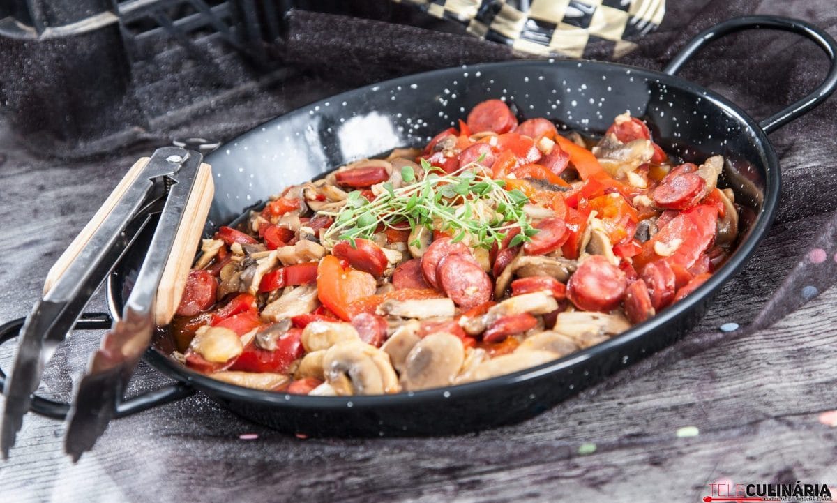 Instruções: 1. Escorra os cogumelos laminados, lave-os e deixe-os escorrer. Retire a pele às linguiças e corte-as em rodelas. Descasque e lave os dentes de alho e pique-os finamente. Arranje os pimentos morrones e corte-os em tiras. 2. Leve uma frigideira ao lume com o azeite, deixe aquecer, junte os alhos e a linguiça e deixe refogar, mexendo de vez em quando, até que comece a ficar douradinho. Adicione depois os cogumelos e os pimentos, tempere com sal e pimenta e deixe cozinhar, mexendo de vez em quando, até os cogumelos ficarem douradinhos. 3. Retifique os temperos, retire do lume e sirva com tomilho fresco. Acompanhe com fatias de pão torradas.