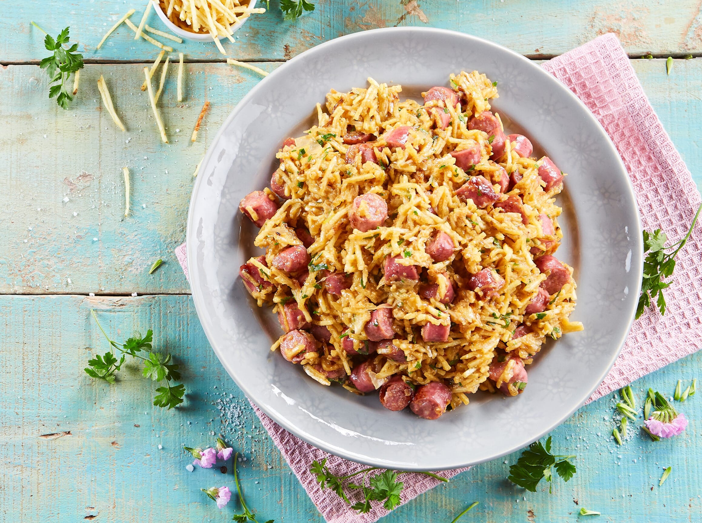 Este prato de salsichas frescas à brás é perfeita para quando não tem muito tempo para cozinhar! Pronto em apenas 30 minutos, esta receita é uma maravilhosa sugestão e uma autêntica delícia. O que acha?