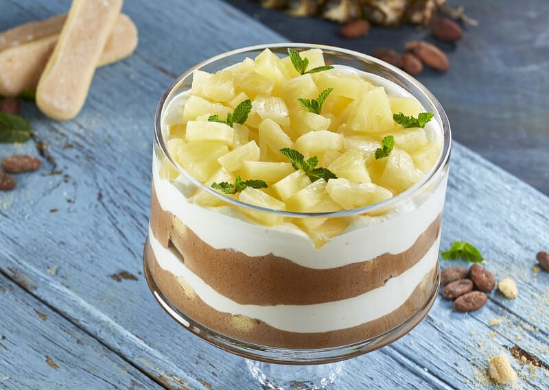 Se é fã de ananás, então imagine este sabor numa sobremesa! Este doce de colher é muito docinho, mas perfeito para partilhar com a sua mãe. Tem ainda sabores de chocolate e de palitos la reine. Experimente! A receita certa para o almoço do dia da mãe 🙂