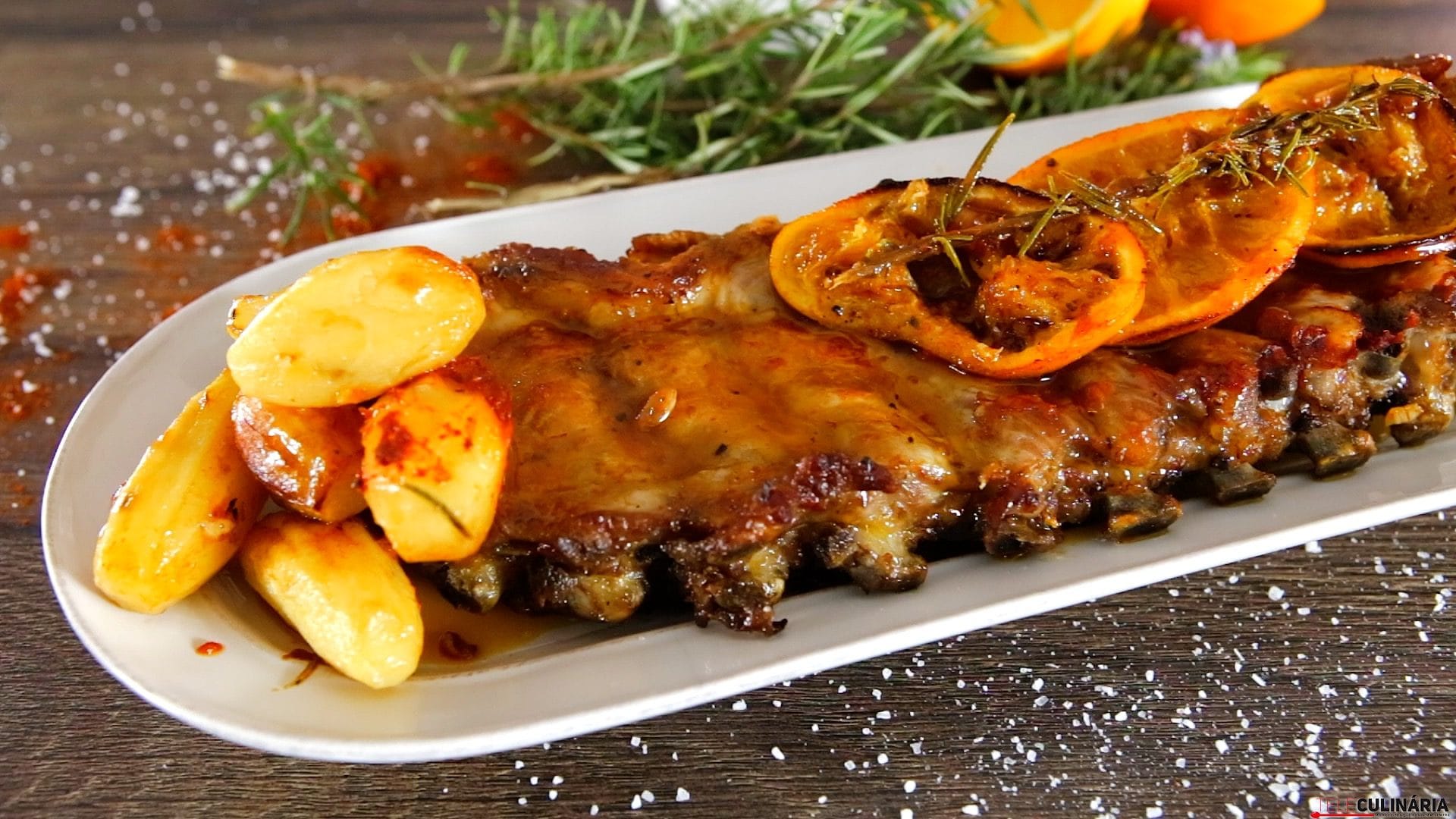 Instruções: 1. Arranje o entrecosto e disponha num tabuleiro. 2. Descasque, lave os dentes de alho e a cebola. Pique os dentes de alho e corte a cebola em meias-luas. 3. Num tabuleiro de forno ou pirex, junte o entrecosto, os dentes de alho, a cebola, o pimentão-doce, o presunto, a folha de louro, o vinho branco, sal e pimenta. Envolva tudo e deixe marinar durante cerca de 20 minutos. 4. Regue com o azeite e leve ao forno durante pré-aquecido a 180ºc, durante cerca de 20 minutos. 5. Descasque as batatas, corte-as em gomos, abra o forno e adicione-as ao tabuleiro. Leve novamente ao forno durante mais 35 minutos aproximadamente ou até que tudo fique assado. Retire do forno e sirva decorado a gosto.