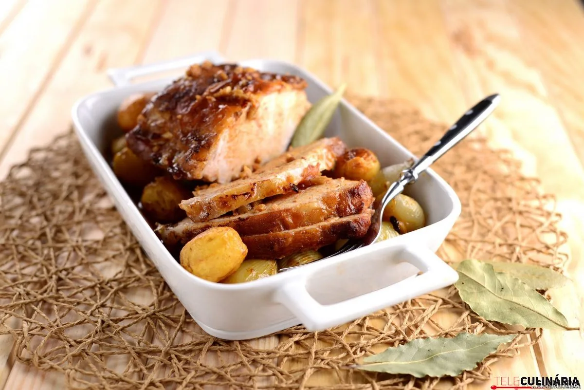 Lombo de porco no forno com cebolinhas novas e batatinhas