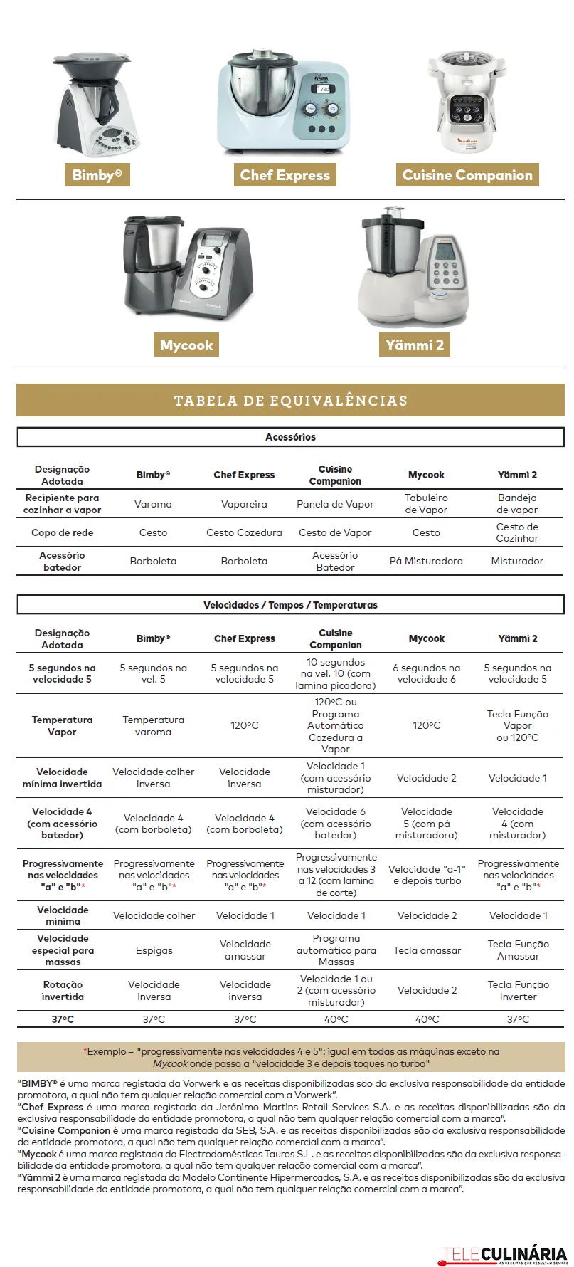 Tabela de equivalências para os Robots de Cozinha: Bimby, Chef Express, Cuisine Companion, Mycook e Yammi. Uma compilação das equivalências de acessórios, velocidades, tempos e temperaturas entre várias marcas de robots de cozinha.