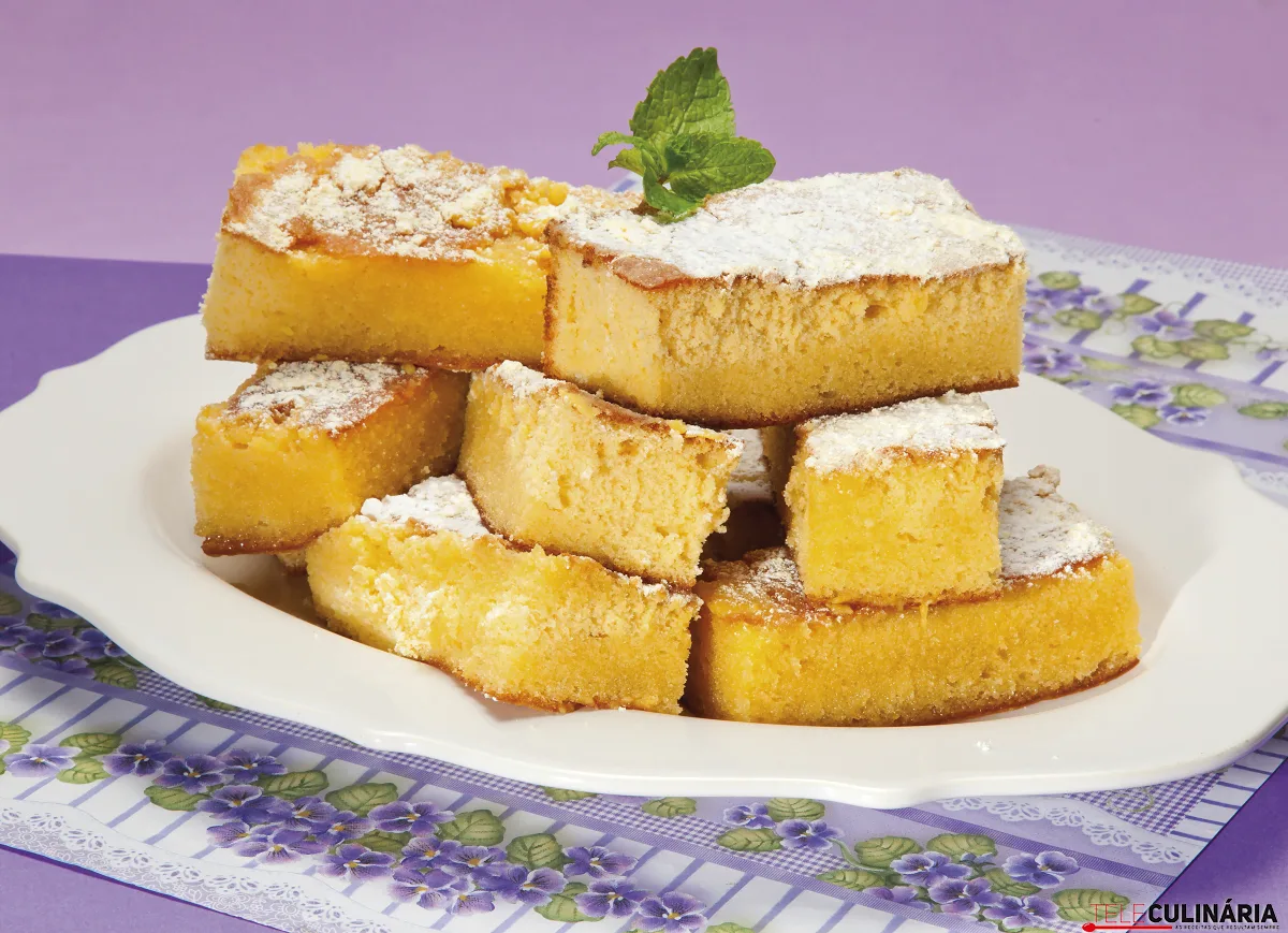 Espete um palito para verificar, retire do forno, regue com a calda que preparou, polvilhe com farinha de milho e deixe repousar para absorver a calda. Depois desenforme, rejeite o papel vegetal, polvilhe também o outro lado do bolo com farinha de milho, corte em rectângulos e sirva decorados a gosto.