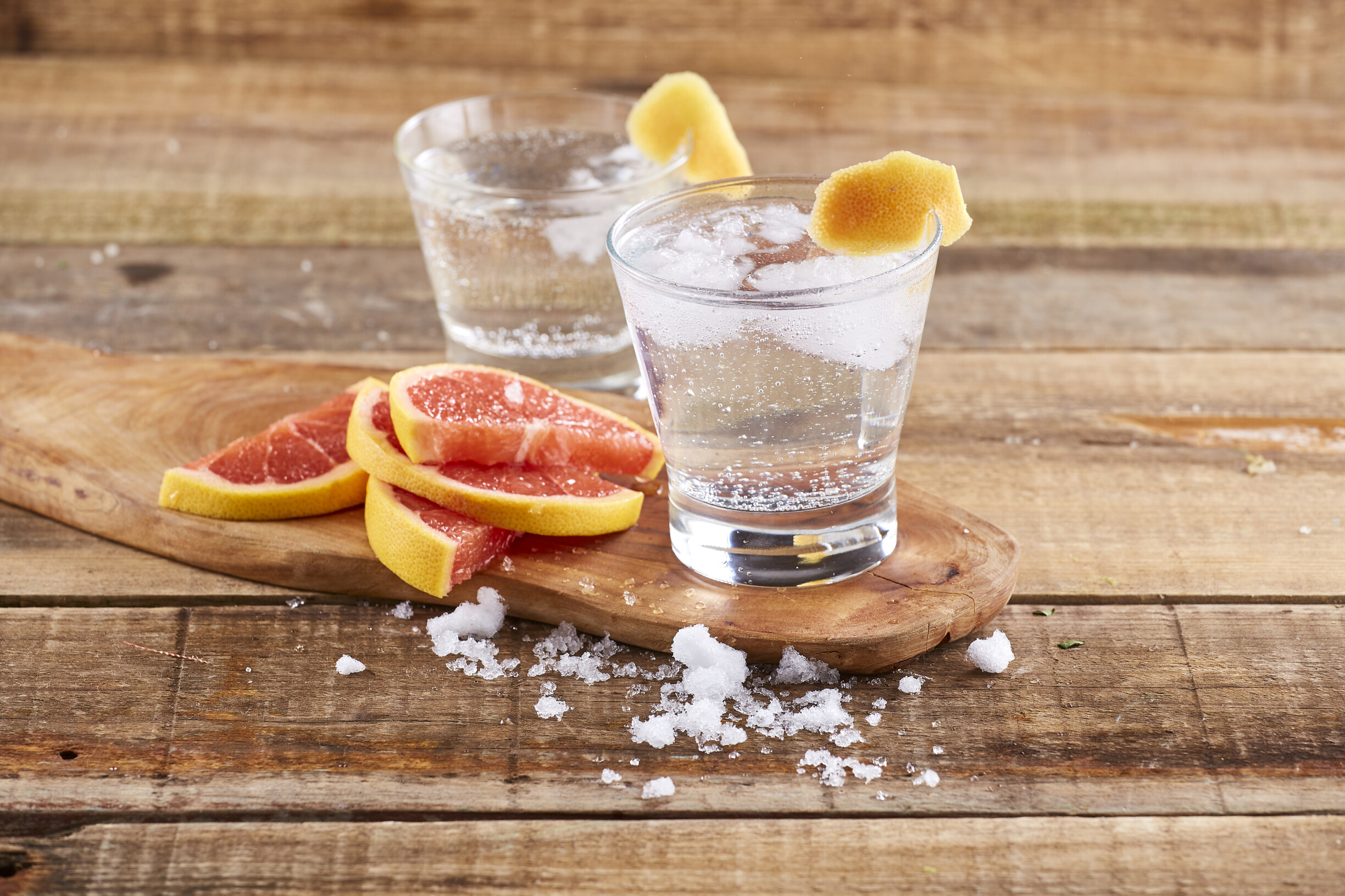- Retire um pedaço da casca da toranja (sem a parte branca) e prenda no copo. Sirva ainda decorado com a restante toranja cortada em meias-luas.