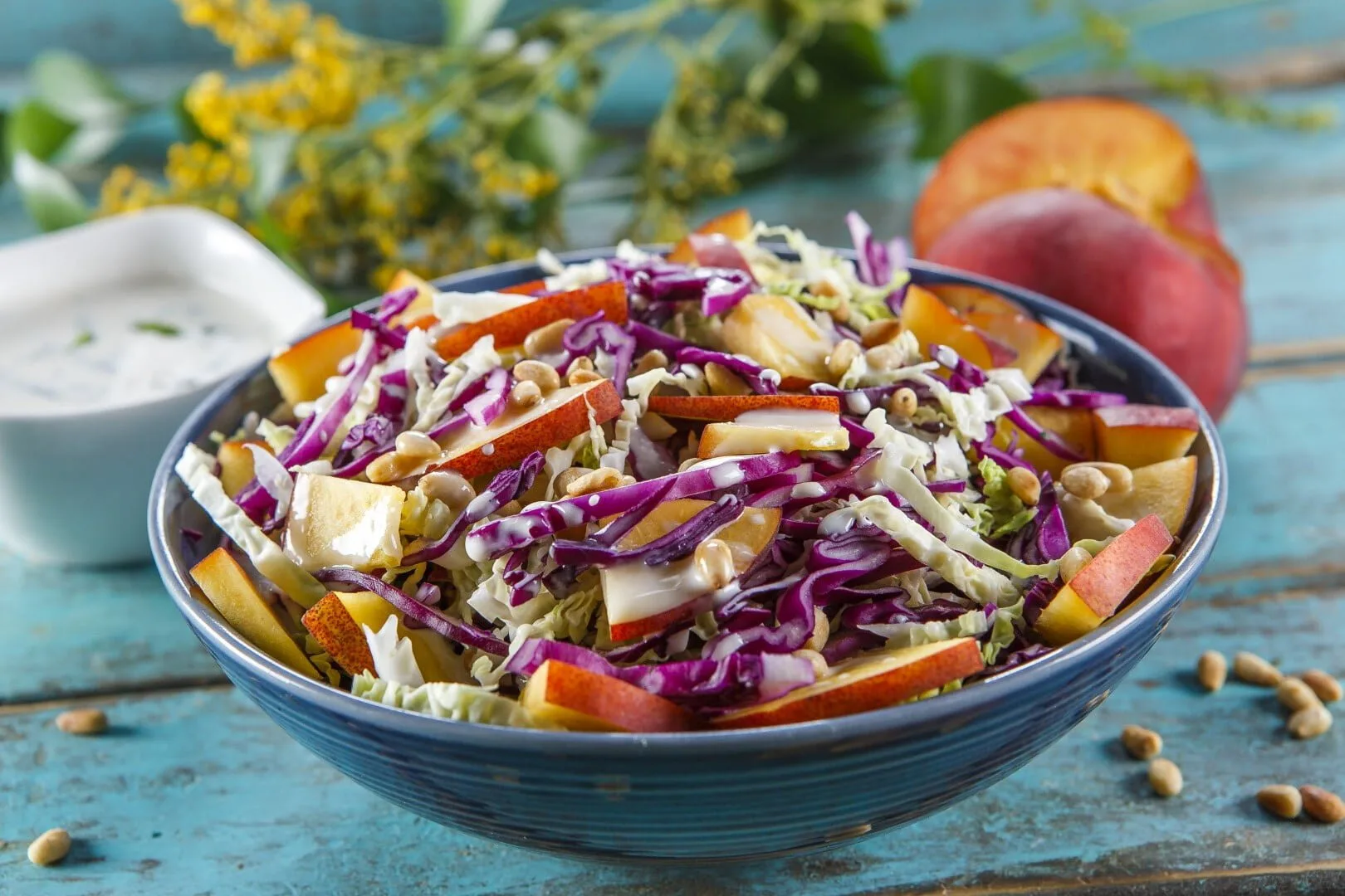 Descasque os pêssegos, retire-lhes o caroço e corte-os em pedacinhos. Lave a couve-roxa e as folhas de lombardo e corte-as em tira finas. Aloure os pinhões numa frigideira antiaderente (sem gordura) e junte todos os ingredientes numa saladeira.
