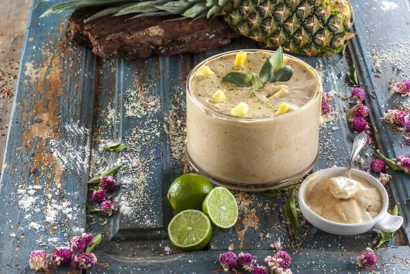 Deite o doce numa taça grande, decore com a raspa das limas, o ananás que reservou e algumas folhas de ananás e leve ao frio, até servir.
