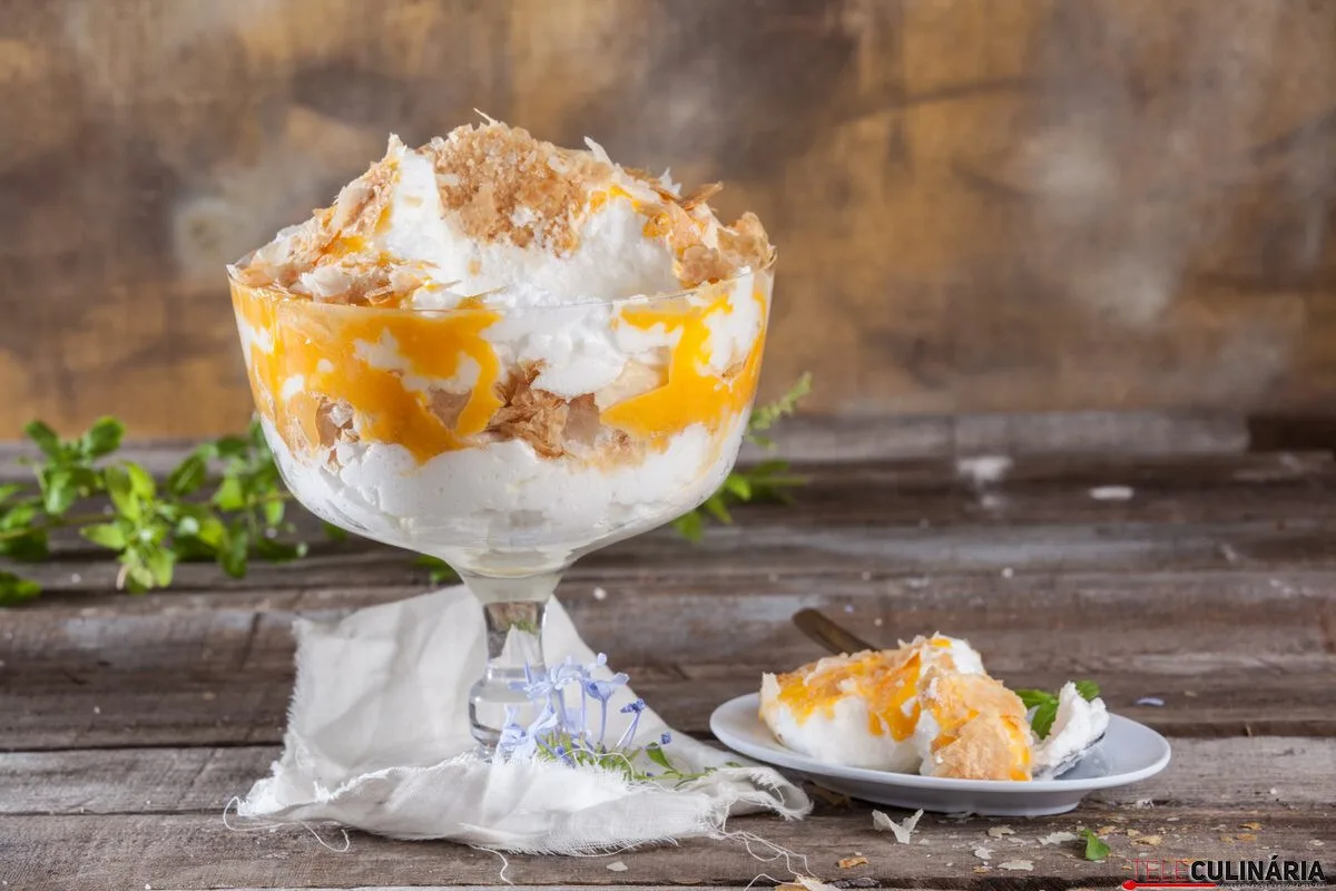 Bata as claras em castelo com o restante açúcar. Coloque um pouco das claras numa taça grande e depois uma parte do folhado esfarelado. Cubra com as restantes claras e os ovos-moles e decore com o restante folhado esfarelado. Leve ao frigorífico até ao momento de servir.