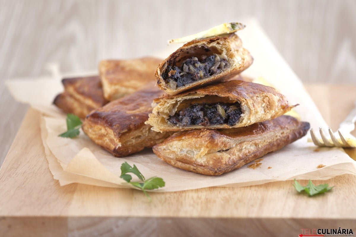 - Corte a massa folhada em rectângulos, disponha o recheio no centro, no sentido do comprimento, dobre e feche os folhados. Pincele a superfície com ovo e leve ao forno a 220ºC durante cerca de 15 minutos.