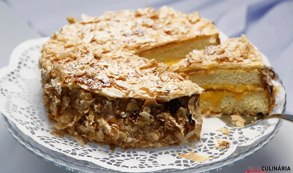 Coloque a forma do bolo sobre a massa folhada e corte dois círculos, aproveitando as aparas. Barre a metade inferior do bolo com cerca de 1/4 do creme, disponha um círculo de massa folhada por cima, barre com mais 1/4 do creme, reponha a parte superior do bolo e barre tudo com o resto do creme. Coloque a outra rodela do folhado por cima, junte as aparas de lado, polvilhe com mais açúcar em pó e sirva.