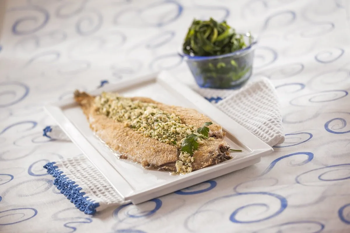Junte um pouco de salsa picada ao ovo e envolva bem. Retire os linguados do forno, faça-lhes um golpe no centro do lombo e recheie com a mistura dos ovos. Regue com o molho que se formou no tabuleiro e sirva decorado a gosto.