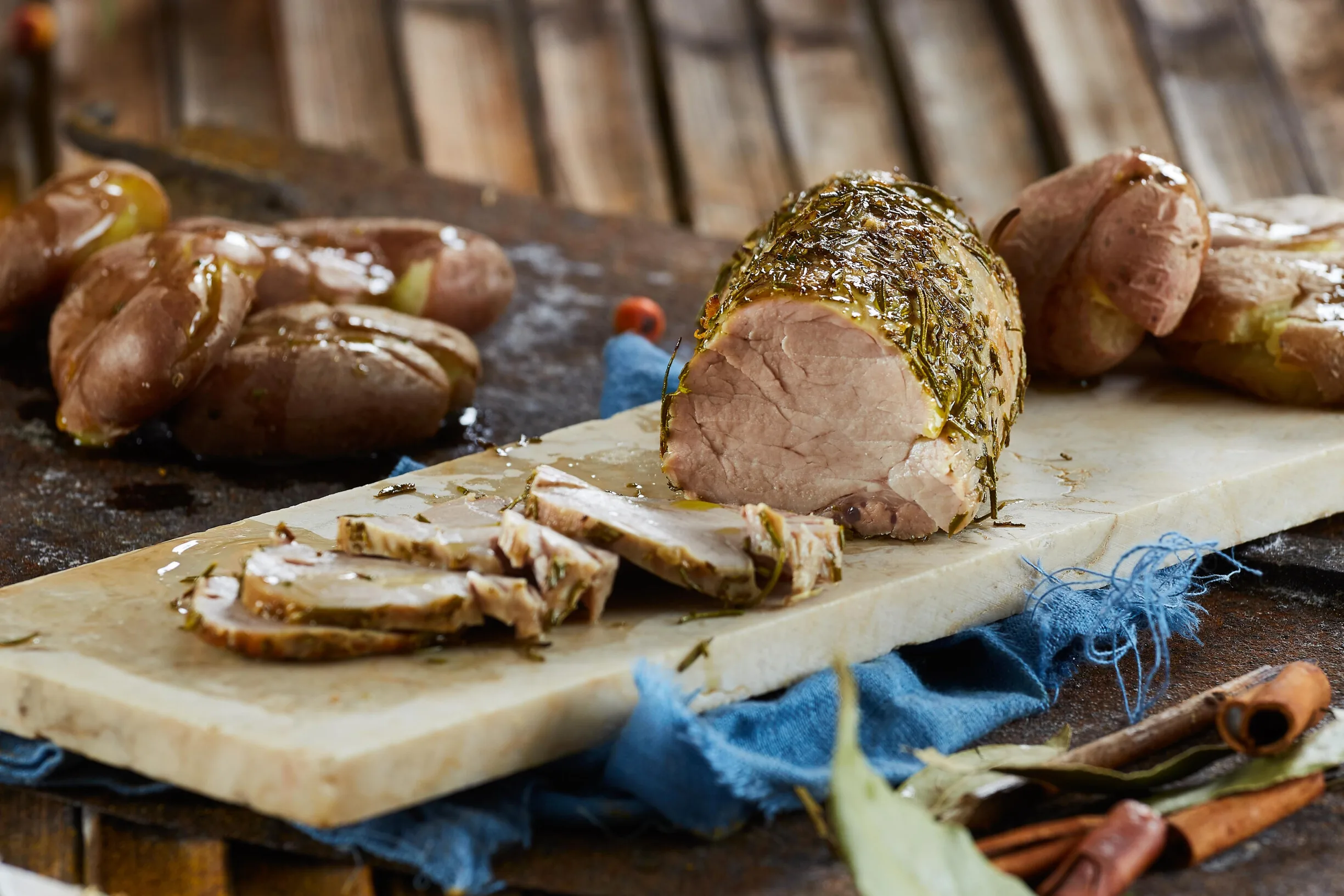 Pique muito bem o alecrim e o tomilho e espalhe-os num tabuleiro. Tempere com sal e pimenta, regue com um pouco de azeite e passe o lombinho por esta mistura.