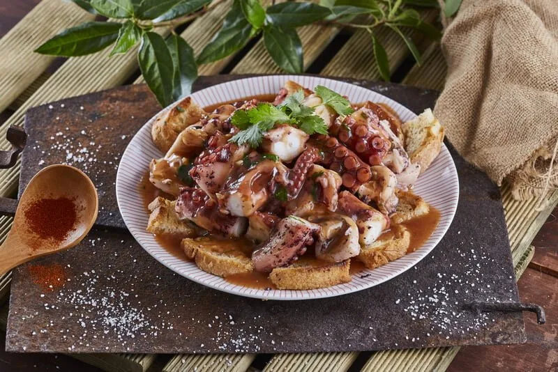 Torre o pão numa torradeira ou no forno e corte-o em pedaços. Espalhe o pão num prato fundo e deite o polvo e o molho por cima. Decore com um raminho de coentros e sirva de imediato.