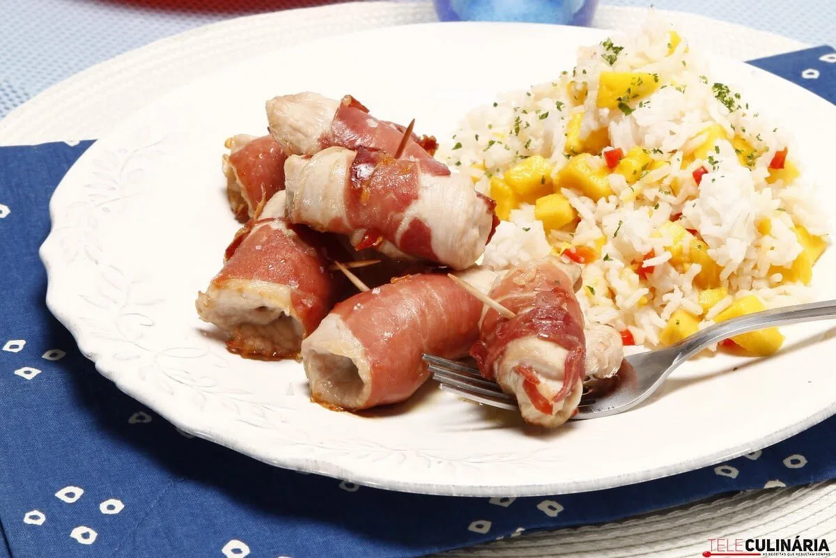Receita de Rolinhos de peru e presunto com arroz de manga e pimento. Descubra como cozinhar a receita de Rolinhos de peru e presunto com arroz de manga e pimento de maneira prática e deliciosa com a Teleculinária!