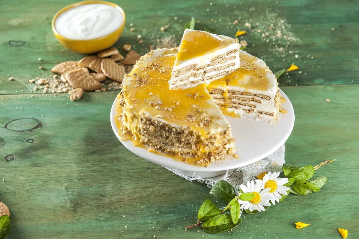 Unte uma forma de fundo amovível com um pouco de óleo e disponha-lhe camadas alternadas do creme anterior e de bolachas previamente demolhadas em café açucarado, sendo que a última camada deve ser de creme. Leve ao frigorífico até que fique bem solidificado.